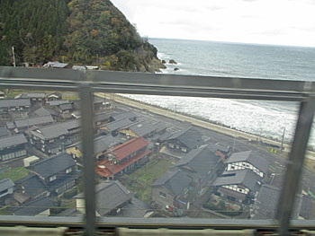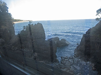 新宮市内でお土産を買うつもりだったのですが、お土産屋さんがありません。駅前の観光案内書で聞いても、ないということでしたので、ないのでしょう。駅前の「徐福寿司」さんで名物「さんま寿司」を買って、駅前のファミリーマートで缶ビールを買って、ここからはまた「くろしお30号」で新大阪まで4時間16分の旅です。途中、こんな海岸線すぐを通っていいの?というほどの所を通りながら、行きと同じルートを戻ります。台風の時期は大変でしょうね。