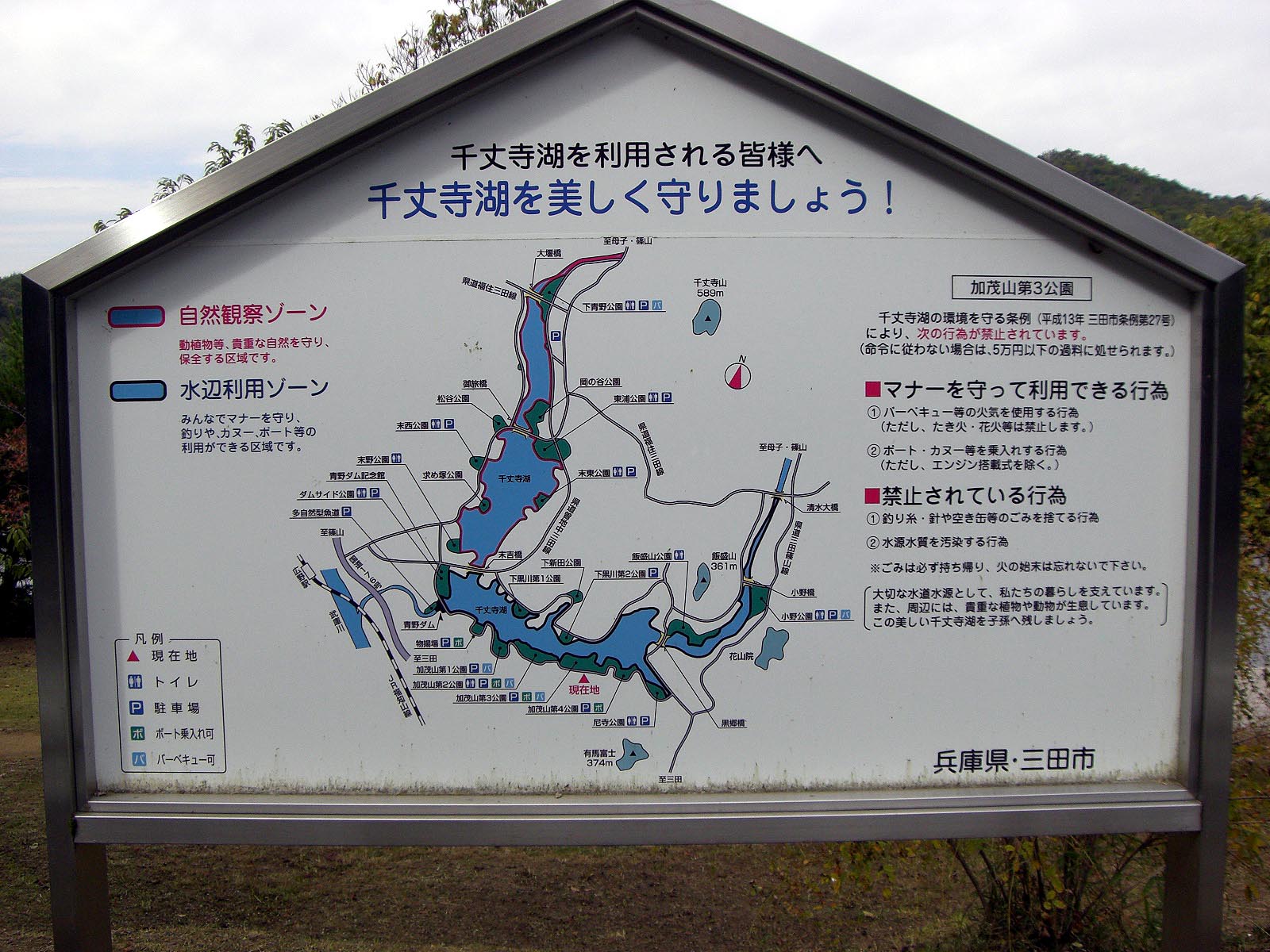 三田市の条例により、北湖(青野川)はボートなどの乗り入れが禁止になりました。北湖は釣りはできますが、カヌーもボートも全くありません。ボートが認められているのは、南湖(黒川)だけです。南湖に向かうと、たくさんボートが出ています。ボートの乗り入れは、上の地図の↑印(物揚場、加茂山第2公園、加茂山第3公園、加茂山第4公園)のみ、認められています。詳しくはここをクリック。