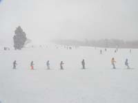 3日目は、雪。山麓ではちょっとしめった雪でしたが、中腹より上はやや粉雪ぎみ。ガスがちょっとかかっています。ガスといっても視界はそんなに悪くありません。昨年の志賀高原の吹雪に比べたら、全然問題になりません。午前中はシュナイダーコースからチャレンジコース、午後はやまびこゲレンデを中心に滑りました。ただ体力がそろそろ限界。3時半にヒュッテ「ポパイ」に集合して、お茶を飲んであがりました。帰ろうと思うと霧が晴れるというのはよくあること。泣く泣くゲレンデを後にしました。