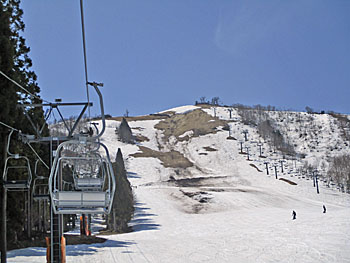 天気は申し分のない快晴、気温も高く、スキーウエアの下は汗ばむほどです。一応4月10日で営業終了とのことですが、最終日はちょっと厳しいかもです。今回は準備不足で、1本目から太ももが痛くなる感じでしたが、その後持ちこたえ、午前中15本、午後10本リフトを乗ったので、まあ良しとしましょう。高速クワッドリフトや、長〜い山頂トリプルリフトに乗ると、他のスキー場より効率よく滑れるので、体力的にはちょっと厳しいものがあります。13時半には、下山リフトを目指しました。